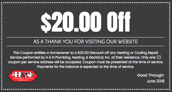 This Coupon entitles a Homeowner to a $20.00 Discount off any Heating or Cooling Repair Service performed by H & N Plumbing, Heating, & Electrical, Inc. at their residence. Only one (1) coupon per service address will be accepted. Coupon must be presented at the time of service. Payments for the balance is expected at the time of service.